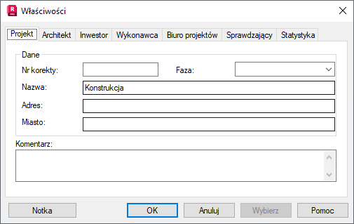 Wybierz opcje Plik Właściwości projektu, aby wprowadzić informacje dotyczące tworzonego projektu konstrukcji.