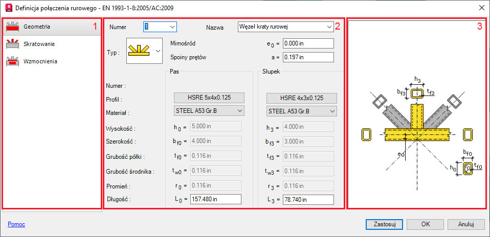 Okno dialogowe do generacji połączenia dla węzła kratownicy (profile rurowe) można podzielić na trzy zasadnicze części: