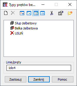 Ta opcja służy do wyboru i/lub definiowania typów prętów stalowych konstrukcji. Opcja dostępna jest: