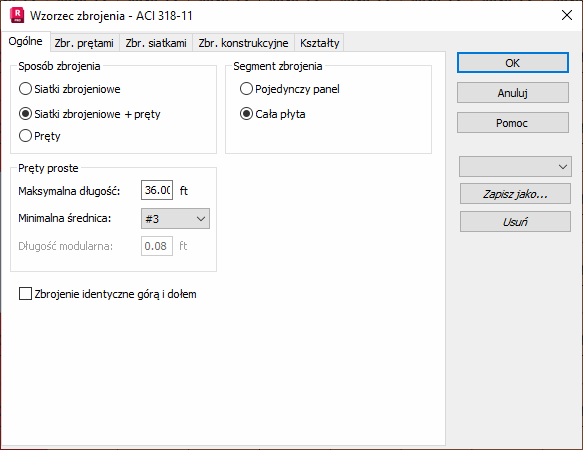 Pręty proste: opcja umożliwia określenie maksymalnej długości prętów prostych jakie mają być stosowane do zbrojenia, średnicę od jakiej ma być stosowany warunek. Dodatkowo opcja długości modularnej określa wartość (moduł), do której ma być zaokrąglona długość pręta. Na przykład pręt o długości 5,36 m w pierwszym segmencie po wpisaniu wartości 0,10 m będzie miał długość 5,40 m.