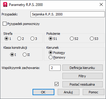Parametry analizy sejsmicznej konstrukcji zależą od wyboru normy sejsmicznej, która będzie wykorzystywana podczas obliczeń konstrukcji poddanej wpływom obciążeń sejsmicznych. Po wyborze marokańskiej normy sejsmicznej RPS 2000 w oknie dialogowym Definicja nowego przypadku lub kliknięciu przycisku Parametry w oknie Typ analizy na ekranie pojawia się przedstawione poniżej okno dialogowe.