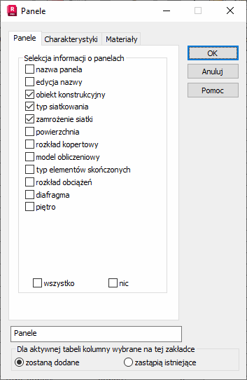 W oknie dialogowym Panele wybierz informacje na temat paneli, które są wyświetlone w tabeli.