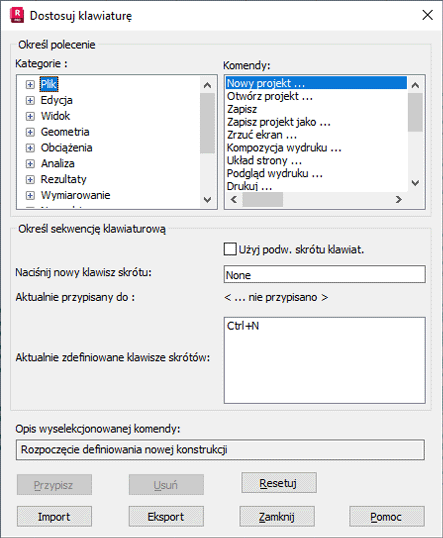 - Naciśnij nowy klawisz skrótu — umożliwia wprowadzenie kombinacji klawiszy dla wybranego polecenia.