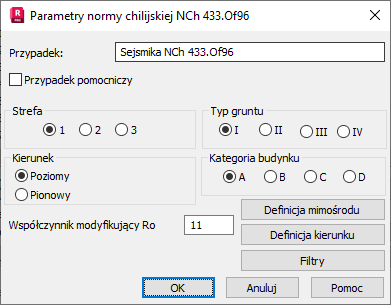 Parametry analizy sejsmicznej konstrukcji zależą od wyboru normy sejsmicznej, która będzie wykorzystywana podczas obliczeń konstrukcji poddanej wpływom obciążeń sejsmicznych. Po wyborze chilijskiej normy sejsmicznej w oknie dialogowym Nowy przypadek lub naciśnięciu klawisza Parametry w oknie Typ analizy na ekranie pojawia się okno dialogowe pokazane poniżej.