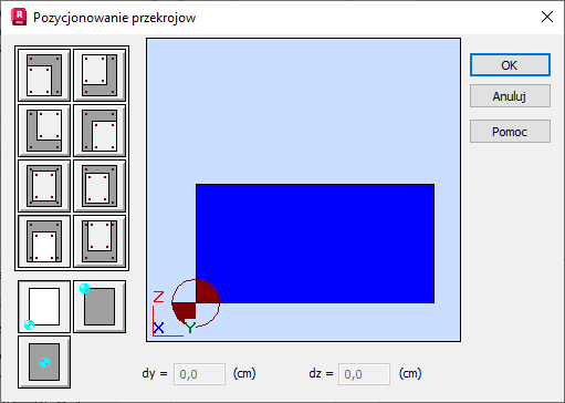 Po wybraniu segmentu i naciśnięciu przycisku Pozycjonowanie na ekranie pojawia się pomocnicze okno dialogowe Pozycjonowanie przekrojów (patrz rysunek poniżej). Przy jego pomocy użytkownik może bezpośrednio usytuować względem siebie segmenty posługując się punktami charakterystycznymi przekrojów np. określając współliniowość względem prawego, górnego narożnika przekrojów. Ponadto istnieje opcja dowolnego pozycjonowania przekrojów poprzez podanie przesunięć segmentów o dy i dz. W takim przypadku istnieje możliwość ustawienia dowolnego położenia punktu odniesienia, względem którego będą pozycjonowane przekroje. Pozycjonowanie może być realizowane w dwóch kierunkach: Y i Z. Kontrolki dy i dz informują o przyroście przesunięcia względem siebie punktów charakterystycznych przekrojów w odniesieniu do wybranego punktu odniesienia. Zmiana punktu odniesienia powoduje automatyczne przeliczenie wartości dy o dz. Odpowiednikiem zaznaczonego segmentu jest przekrój oznaczony szarym kolorem, przekrój z kolorem żółtym odpowiada sąsiedniemu segmentowi, względem którego dokonuje się pozycjonowania.