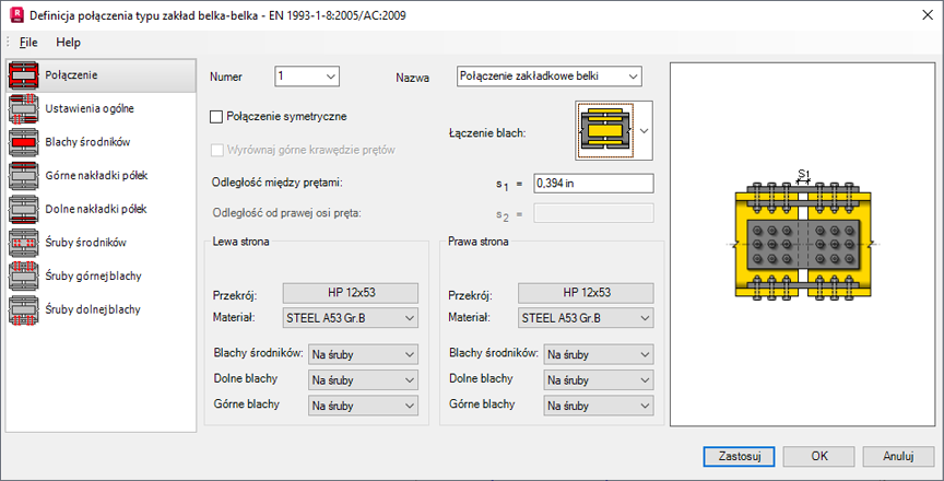Uwaga: Prawa strona połączenia jest używana jako strona odniesienia symetrii. Jeśli ta opcja jest wybrana, wszystkie parametry zastosowane do prawej strony połączenia zostaną skopiowane na jego lewą stronę.