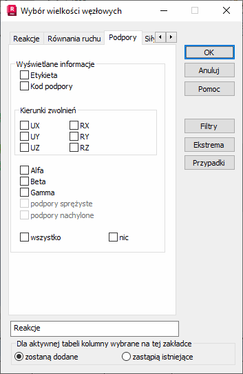 Uwaga: Jeśli okno dialogowe do wyboru informacji przedstawianych w tabeli jest otwierane bezpośrednio z tabeli podpór, to w oknie dialogowym będą znajdowały się dodatkowe charakterystyki podpory.