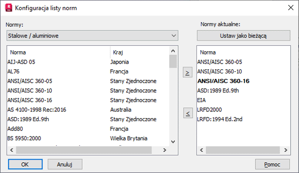 Użyj tego okna dialogowego, aby skonfigurować listę dostępnych norm dla norm projektowych i obciążeń.
