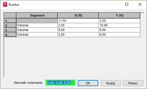 w oknie dialogowym Polilinia — kontur. Wszystkie współrzędne i parametry konturu wyświetlane są w postaci tabelarycznej. Parametry w tabeli są parametrami konturu, który jest aktualnie aktywny w oknie dialogowym Polilinia — kontur.