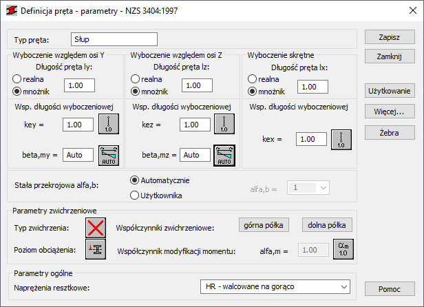 Stała przekroju pręta jest używana, aby wybrać stałą przekroju pręta alfa,b, która określa współczynnik wyboczenia. Wartość stałej przekroju pręta może być wybrana automatycznie, w zależności od typu przekroju i klasy.