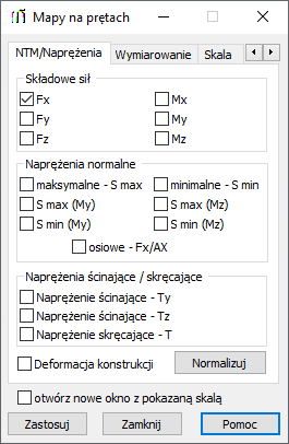 Dla konstrukcji prętów ta opcja pozwala wyświetlić kolorowe mapy uzyskane z analizy sił poprzecznych, naprężeń, deformacji itp. w konstrukcji.