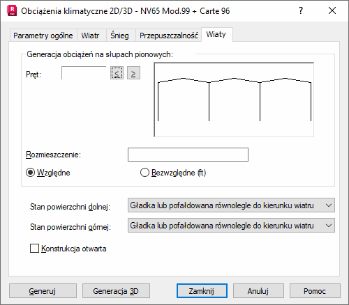 - Stan powierzchni ścianek dolnych i górnych przykrycia. Jest to informacja potrzebna, aby obliczyć siłę podłużną wywołaną tarciem o dach dla przypadków wiatrowych z przodu do tyłu i z tyłu do przodu.