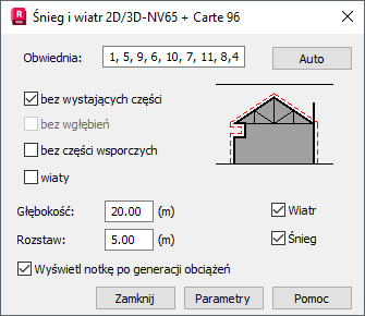 - Bez elementów wsporczych i wiaty - Jeżeli wybrana została ta opcja, obwiednia generowana jest automatycznie, bez uwzględniania elementów wsporczych konstrukcji. Istnieje zatem możliwość rozpoznania obwiedni dla konstrukcji izolowanej aerodynamicznie.