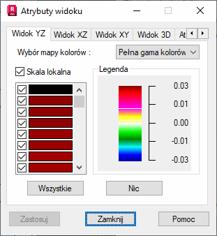 W oknie dialogowym Atrybuty widoku można zdefiniować skalę i kolory prezentacji naprężeń w poszczególnych przekrojach pręta.