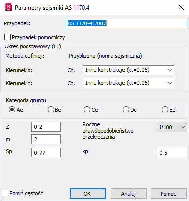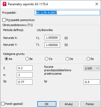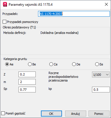 Parametry uproszczonej analizy sejsmicznej z wykorzystaniem metody zastępczej siły poziomej uzależnione są od normy sejsmicznej oraz metody definiowania wartości okresów podstawowych wybranych w oknie dialogowym Analiza sejsmiczna.