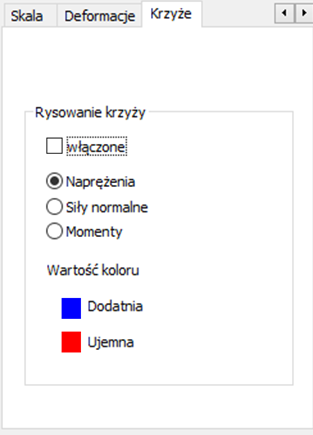 Wyniki dla powierzchniowych elementów skończonych mogą być prezentowane w postaci izolinii (map) lub krzyży. Krzyże wybranej wielkości będą prezentowane, jeżeli na pokazanej na powyższym rysunku karcie wybrana zostanie opcja Włączone. Dostępne są trzy rodzaje wielkości, dla których wyniki mogą być prezentowane w formie krzyży: naprężenia, siły lub momenty. Krzyż reprezentuje wartości maksymalne i minimalne obrócone zgodnie z układem głównym.