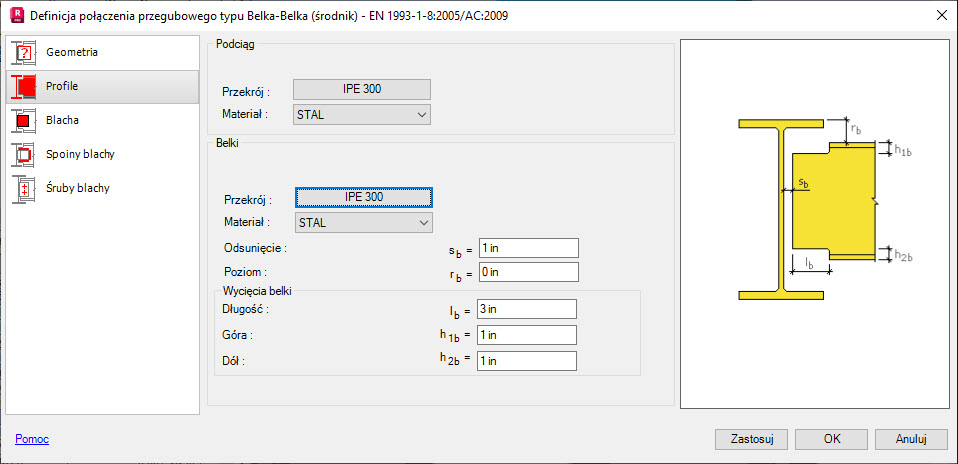 Na zakładce Przekroje możliwa jest definicja przekrojów podciągu i belki w połączeniu.