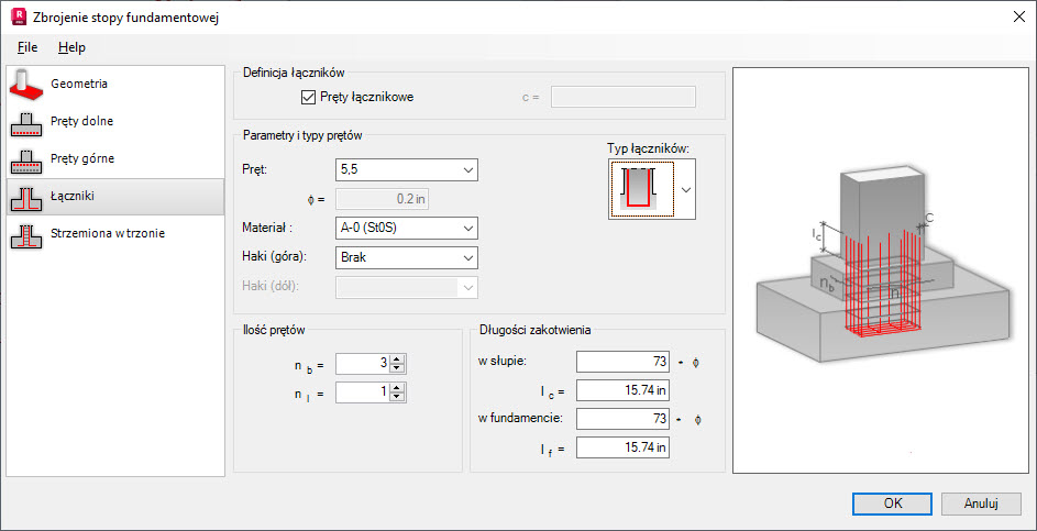 Aby wygenerować zbrojenie łącznikowe w stopie fundamentowej, w polu Definicja łącznika należy wybrać pozycję Łączniki. Następnie można zdefiniować parametry zbrojenia łącznikowego: