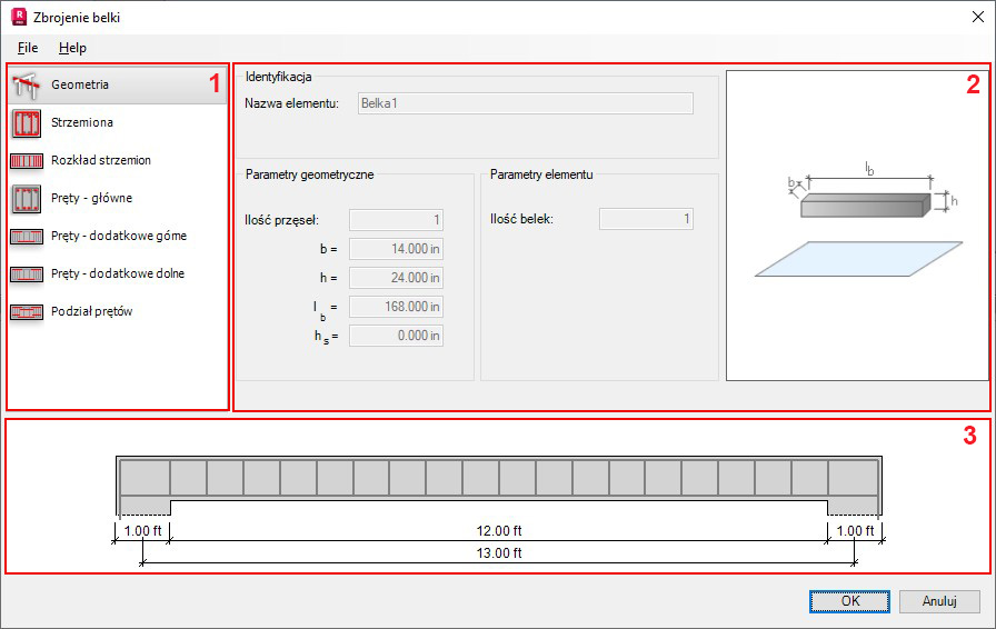 Okno dialogowe służące do generowania zbrojenia belek jest podzielone na trzy główne części.