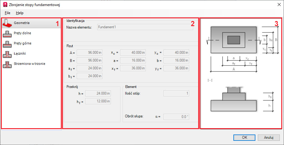 Okno dialogowe Zbrojenie stopy fundamentowej jest podzielone na trzy główne części:
