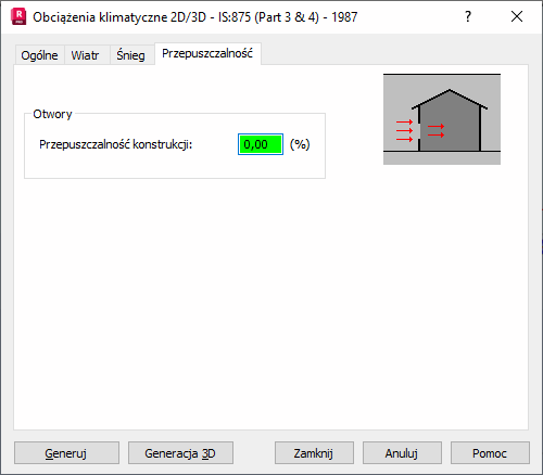 Okno to służy do definicji całkowitej przepuszczalności konstrukcji. Wartość przepuszczalności ma wpływ na wartość współczynników Cpi.
