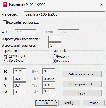 Parametry analizy sejsmicznej konstrukcji zależą od normy sejsmicznej, która będzie stosowana podczas obliczeń konstrukcji poddanej wpływom obciążeń sejsmicznych. Po wyborze rumuńskiej normy sejsmicznej P100—1—2004 w oknie dialogowym Definicja kierunku lub naciśnięciu klawisza Parametry w oknie Typ analizy.