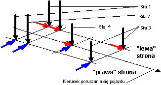 Zdefiniowany został zestaw sił dla pojazdu tak jak pokazano to na rysunku poniżej.