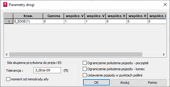 W dolnej części okna dialogowego znajduje się pole edycyjne Tolerancja. Jest to parametr przypisany do zdefiniowanego przypadku analizy obciążeń ruchomych. Tolerancja określa warunki generacji obciążeń na prętach od zdefiniowanego pojazdu. Włączenie opcji Moment od mimośrodu siły powoduje generację obciążenia momentem skupionym od siły skupionej, przykładanej na pręcie z uwzględnieniem mimośrodu.