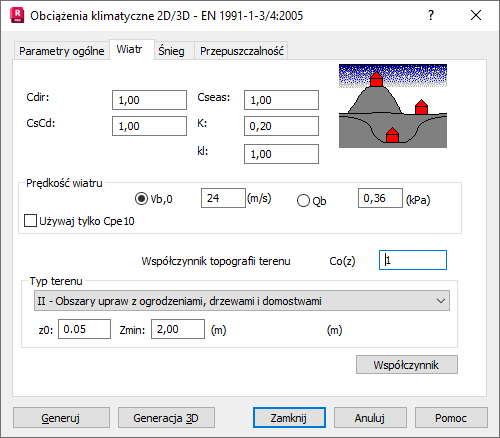 W polu Typ terenu określony może zostać typ terenu, na którym znajduje się konstrukcja. Po wyborze kategorii terenu automatycznie zmieniane są wartości parametrów: Kt, z0 i Zmin. Wartości tych parametrów można również określić ręcznie.