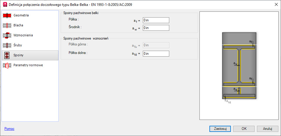Na zakładce Spoiny znajdują się opcje pozwalające na definicję grubości spoin łączących belki z blachą doczołową oraz spoin łączących elementy wzmacniające.