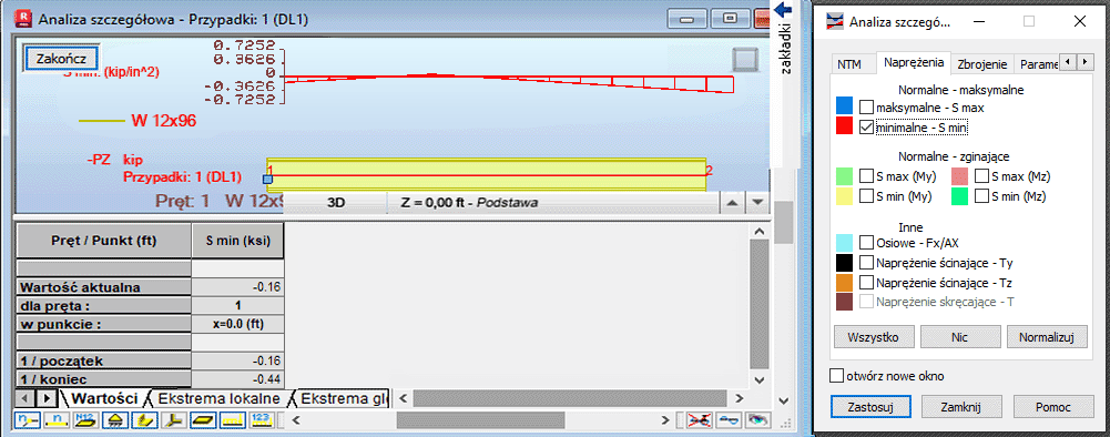 Opcja służy do prezentacji szczegółowych wyników (wykresy, tabele) dla wybranych prętów konstrukcji.