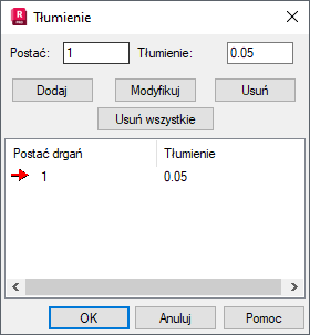 Definicja odbywa się przez wpisanie numeru postaci oraz odpowiadającej wartości tłumienia oraz naciśnięciu klawisza Dodaj.
