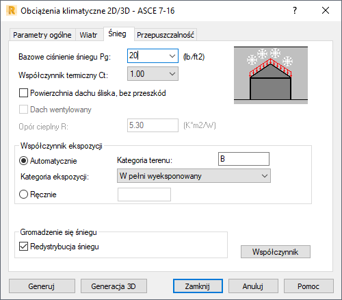 - W polu Gromadzenie śniegu opcja Niezrównoważone obciążenie powodowane przez śnieg generuje obciążenia powodowane przez zalegający śnieg, które uwzględnia przesuwanie się masy śniegu po nachylonym dachu, opady śniegu, jak również nagromadzony śnieg za pomocą różnych odwzorowań dachu (rynny i odpływy). Domyślnie, obciążenia powodowane przez śnieg są generowane z uwzględnieniem niezrównoważonych obciążeń dachu powodowanych przez śnieg.