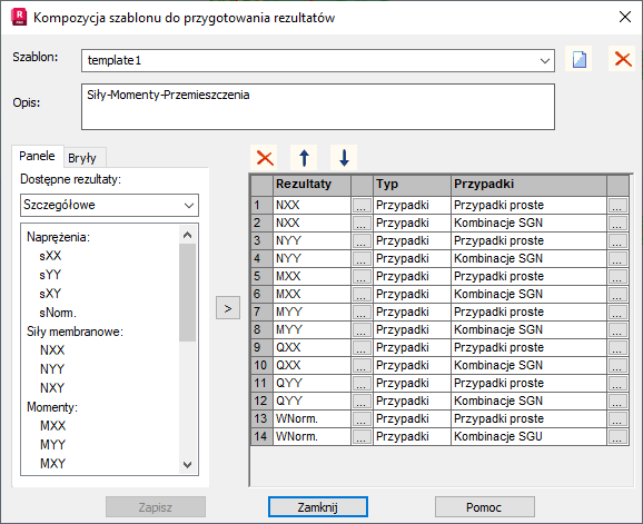 - W kolumnie Typ można określić, jakie zostaną przygotowywane typy wyników (siły, momenty, naprężenia, przemieszczenia itp.).