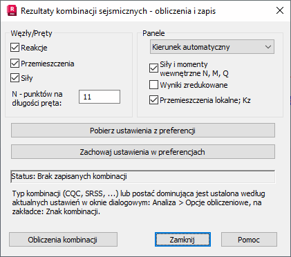Aby uruchomić proces obliczeń i zapisać wybrane wyniki kombinacji sejsmicznych, należy kliknąć przycisk Obliczenia kombinacji. — Brak zapisanych kombinacji — komunikat jest wyświetlany w przypadku braku uruchomienia lub przerwania procesu obliczeń i zapisu wyników dla kombinacji sejsmicznych. W przypadku wyłączenia opcji zapisywania wcześniejszych wyników obliczeń przy aktywnym stanie zapisywania zamknięcie i ponowne otwarcie okna dialogowego spowoduje ponowne wybranie tego typu wyniku.