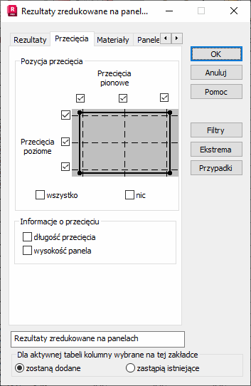 W powyższym oknie dialogowym mogą zostać wybrane położenia przecięć, dla których obliczane będą wartości zredukowane. Dodatkowo włączone mogą zostać informacje dotyczące przecięcia: długość przecięcia i wysokość panelu.