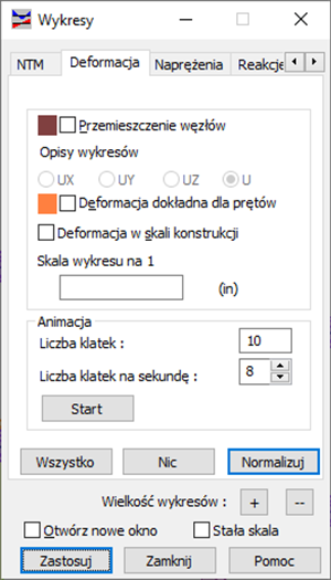 W tym oknie wybrana może zostać prezentacja odkształcenia powstałego pod wpływem obciążenia konstrukcji.