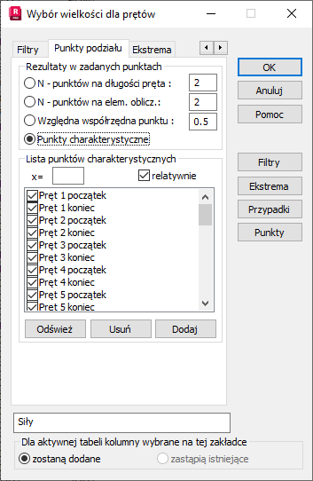 Jeżeli wybrana zostanie opcja N — punktów na długości pręta, to w odpowiednim polu określona może zostać liczba punktów (w tym węzeł początkowy i końcowy pręta) rozłożonych równomiernie na długości pręta, dla których prezentowane będą wartości. Domyślnie N=2, co oznacza, że wartości wybranych do prezentacji wielkości będą przedstawiane w tabeli jedynie dla początku i końca pręta. Dla N=3 w środku pręta zostanie dodany punkt (pręt zostanie podzielony na dwa równe odcinki), w którym dodatkowo przedstawiane będą wyniki. Punkt podziału można również określić, wybierając opcję Względna współrzędna punktu. Należy podać liczbę z przedziału (0,1) określającą odległość punktu od początku pręta w stosunku do długości pręta. Jeżeli wybrana zostanie karta Punkty charakterystyczne, to będzie można określić punkt na długości pręta (podając odległość od początku pręta — bezwzględnie lub względnie), w którym należy przedstawić wartości wybranych wielkości. Wartości będą prezentowane w tabeli.