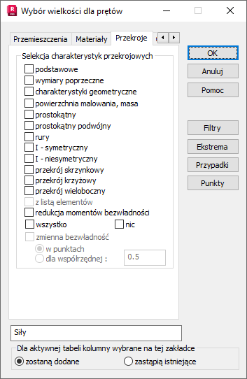 W tym oknie do prezentacji mogą zostać wybrane następujące informacje o przekrojach prętów: