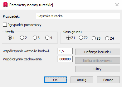 Parametry analizy sejsmicznej konstrukcji zależą od wyboru normy sejsmicznej, która będzie wykorzystywana podczas obliczeń konstrukcji poddanej wpływom obciążeń sejsmicznych. Wybierz turecką normę sejsmiczną w oknie dialogowym Definicja nowego przypadku lub naciśnij przycisk Parametry w oknie Typ analizy