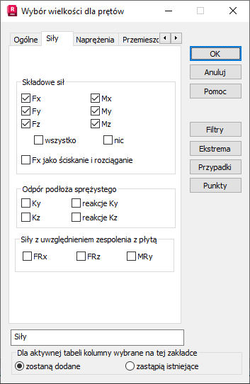 - FY, FZ — jeżeli ta opcja zostanie wybrana, to w tabeli pojawi się kolumna, w której prezentowane będą wyznaczone w trakcie analizy konstrukcji siły ścinające FY lub FZ (siły podawane są w lokalnym układzie współrzędnych pręta).