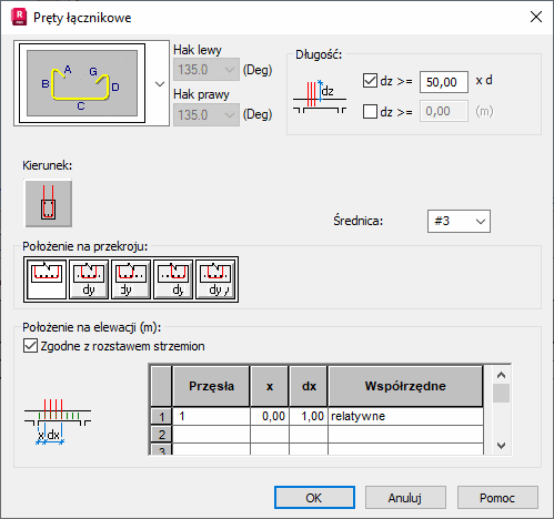 W tym oknie dialogowym określone mogą zostać parametry prętów łącznikowych: