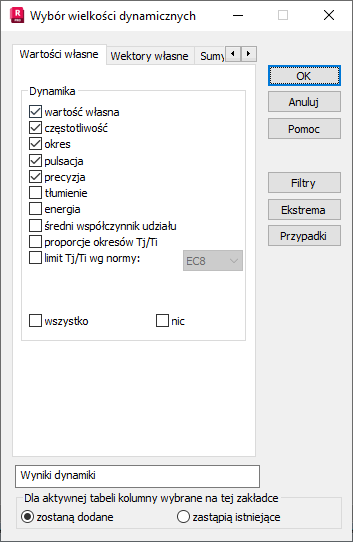 Po wybraniu karty Wartości własne w oknie dialogowym Kolumny tabeli można wybrać wielkości analizy dynamicznej do prezentacji.