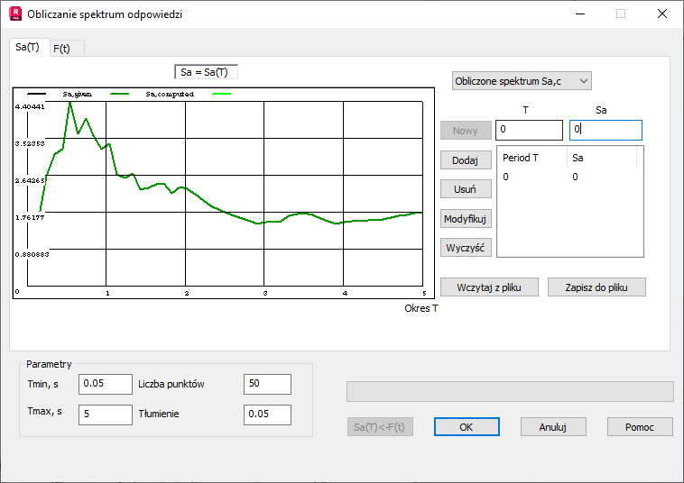 Po wybraniu karty Sa(T) w oknie dialogowym Obliczanie spektrum odpowiedzi można zdefiniować funkcję Sa=Sa(T).