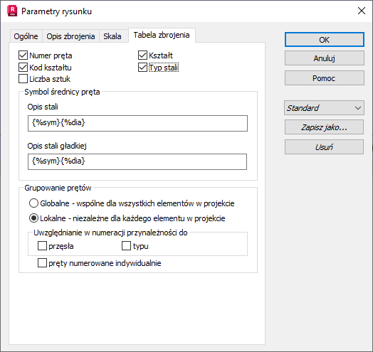 (Parametry rysunku) a następnie wybierz kartę Tabela zbrojenia.