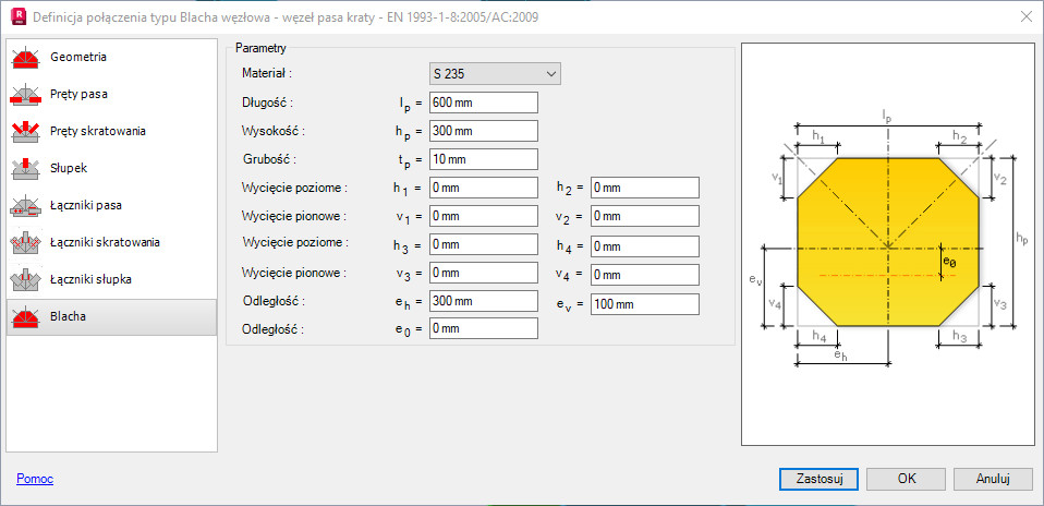 Opcje znajdujące się na tej zakładce umożliwiają definicję parametrów geometrycznych blachy węzłowej; na tej zakładce dokonany może również wybór materiał, z którego blacha ma zostać wykonana.