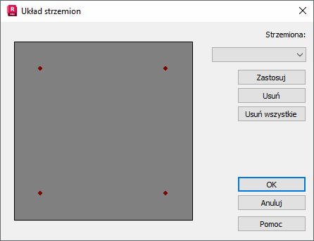 Aby zdefiniować strzemię o wybranym kształcie, należy klikać lewym przyciskiem myszy kolejne pręty podłużne. Zakreślony zostaje kształt i układ zbrojenia poprzecznego. Wyznaczone kształty strzemion powinny być figurami zamkniętymi. Symbolem szpilki lub szekli jest odcinek prosty łączący dwa pręty podłużne. Po każdorazowym zdefiniowaniu kształtu strzemienia naciśnięcie przycisku Zastosuj powoduje zatwierdzenie definicji kształtu strzemienia. Po określeniu kształtu i zatwierdzeniu zmian zdefiniowany kształt strzemienia widoczny jest na rysunku przekroju poprzecznego słupa.