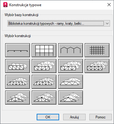 Opcja służy do wyboru/definiowania typowych konstrukcji (elementów konstrukcji). Opcja dostępna jest w menu tekstowym jak i ikonowym: po naciśnięciu ikony Konstrukcja biblioteczna