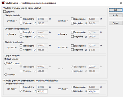 - Dla każdego z przemieszczeń, które ma być sprawdzone, należy określić, czy wartości graniczne są względne czy bezwzględne, a następnie wprowadzić ugięcia pręta w kierunkach Y i Z.