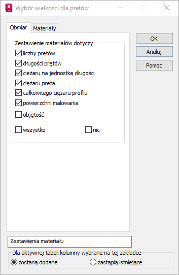 - Długość pręta — dodaje kolumnę dla całkowitej długości pręta. W dolnej części tabeli w tej kolumnie prezentowana będzie całkowita długość prętów wyprowadzonych z danego przekroju.